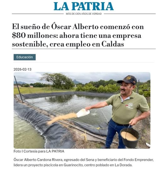Rivera, egresado del Sena y beneficiario del Fondo Emprender, lidera un proyecto piscícola en Guarinocito, centro poblado en La Dorada Caldas. Aquí está un ejemplo que podría ser redondeado a varias palabras. Ilusión, empeño, visión, espera, emprendimiento y realización. La nota corresponde a uno reporte del Servicio Nacional de Aprendizaje (Sena).
